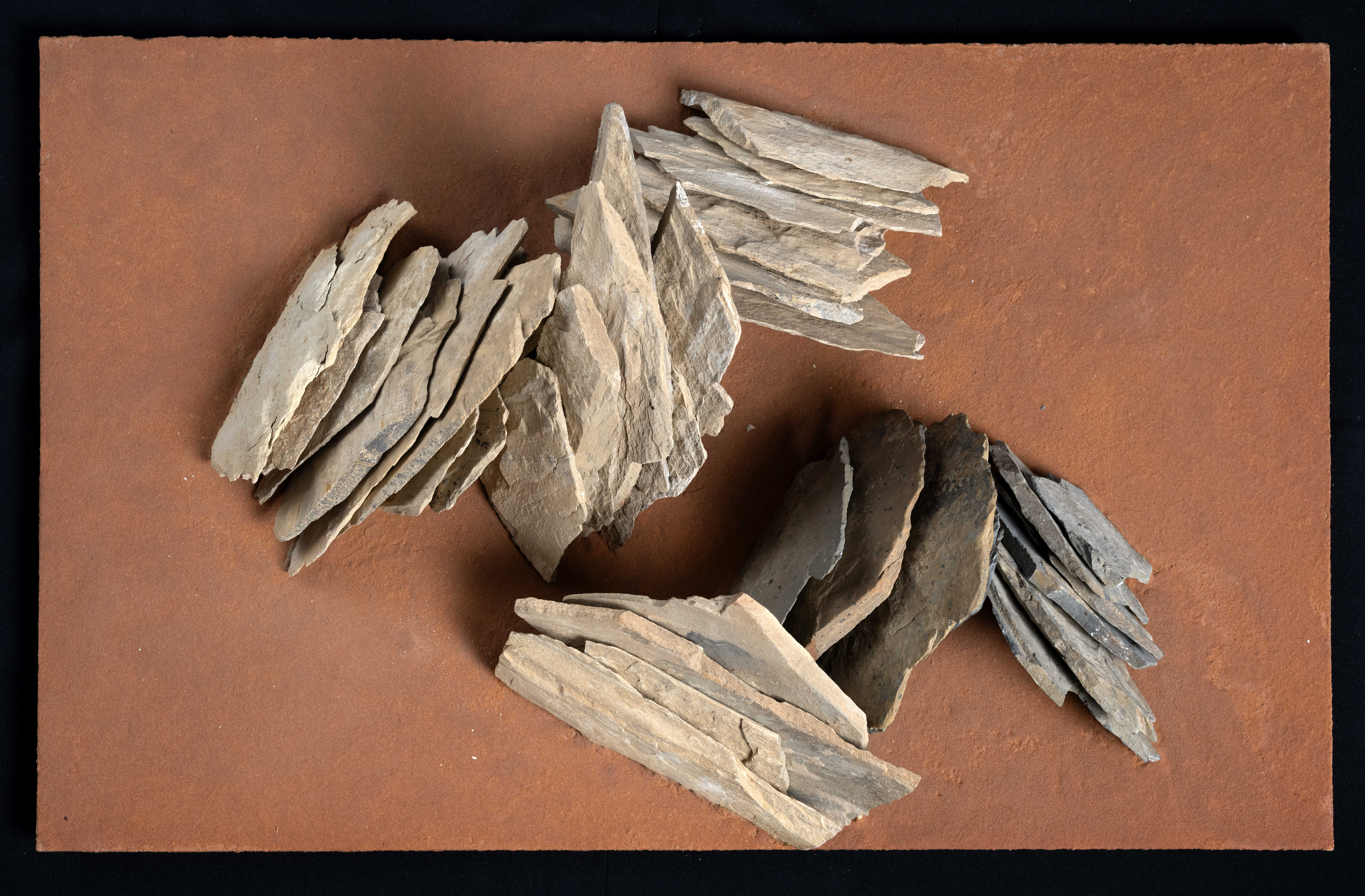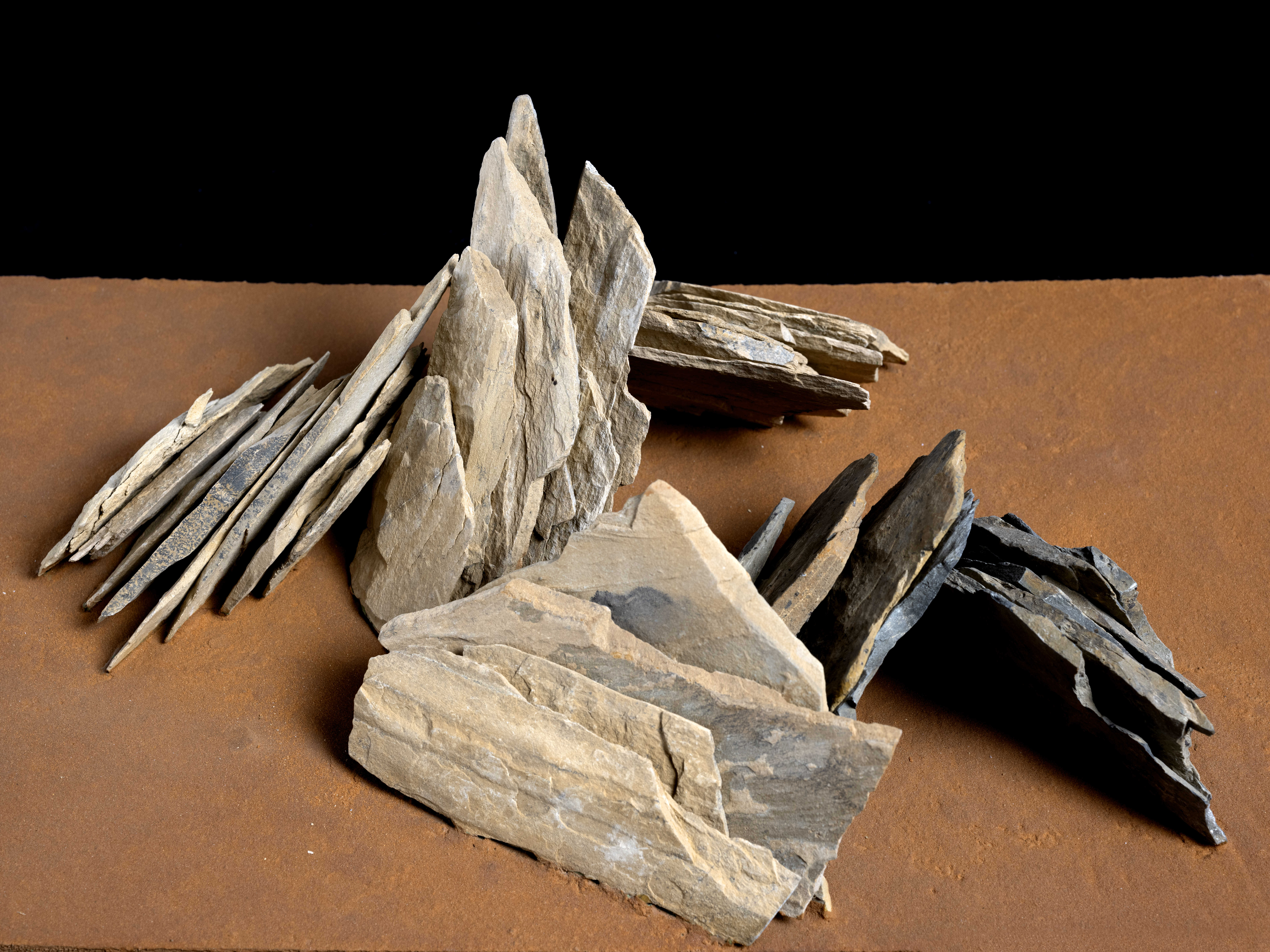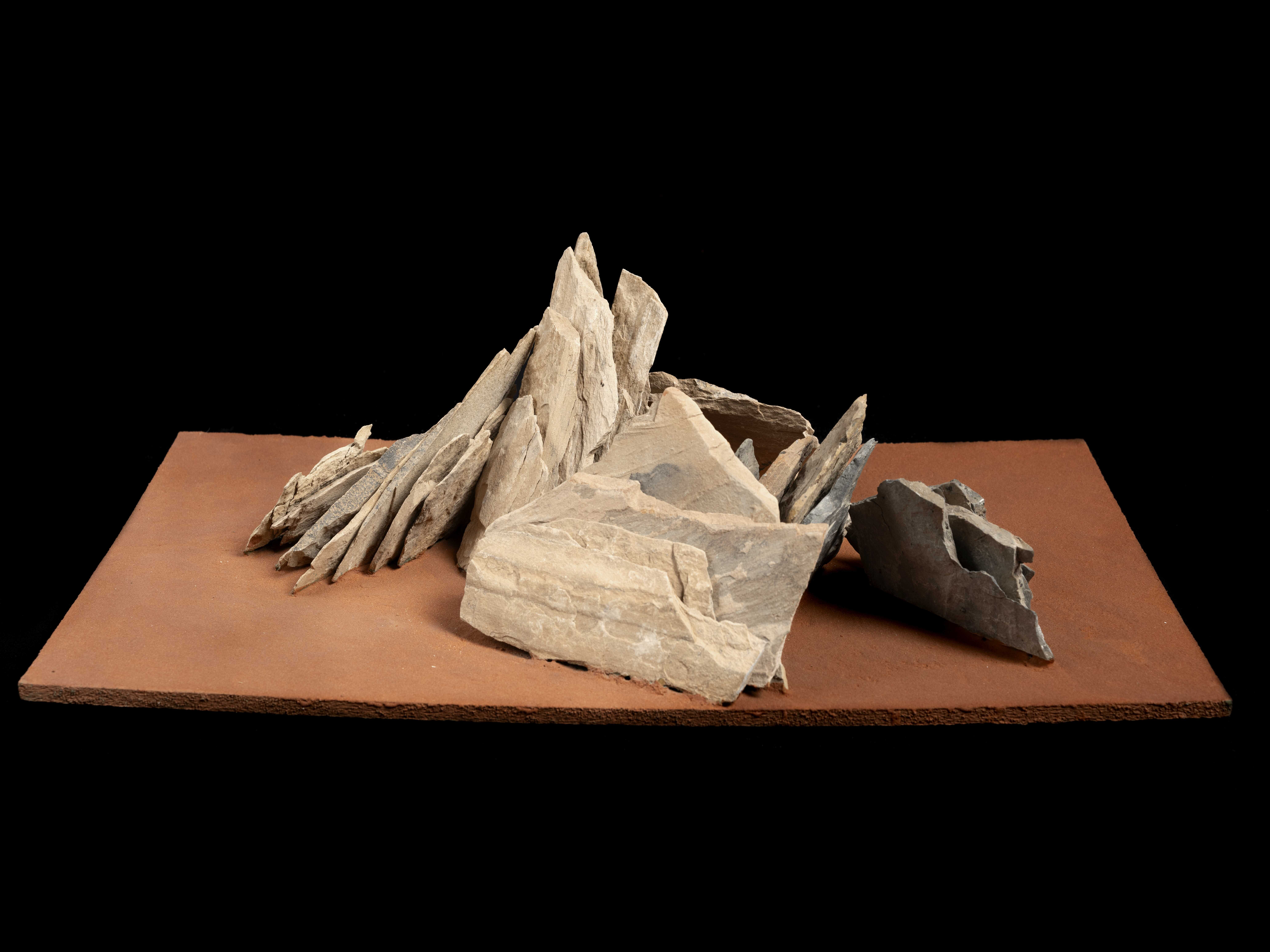 Μακέτα - βράχος ώχρας και πράσινος σχιστόλιθος σε κόκκινο αμμώδες υπόβαθρο / έδαφος