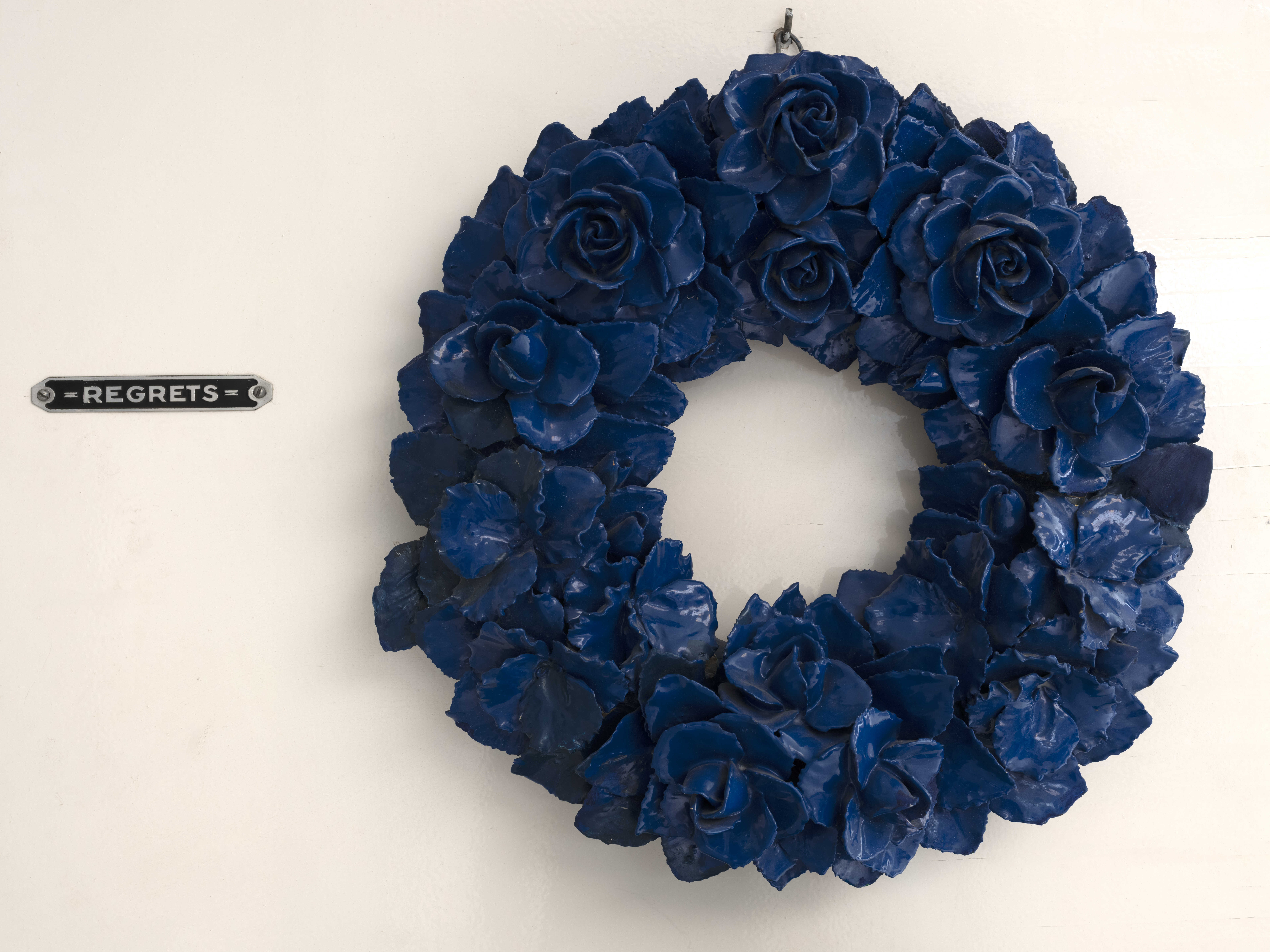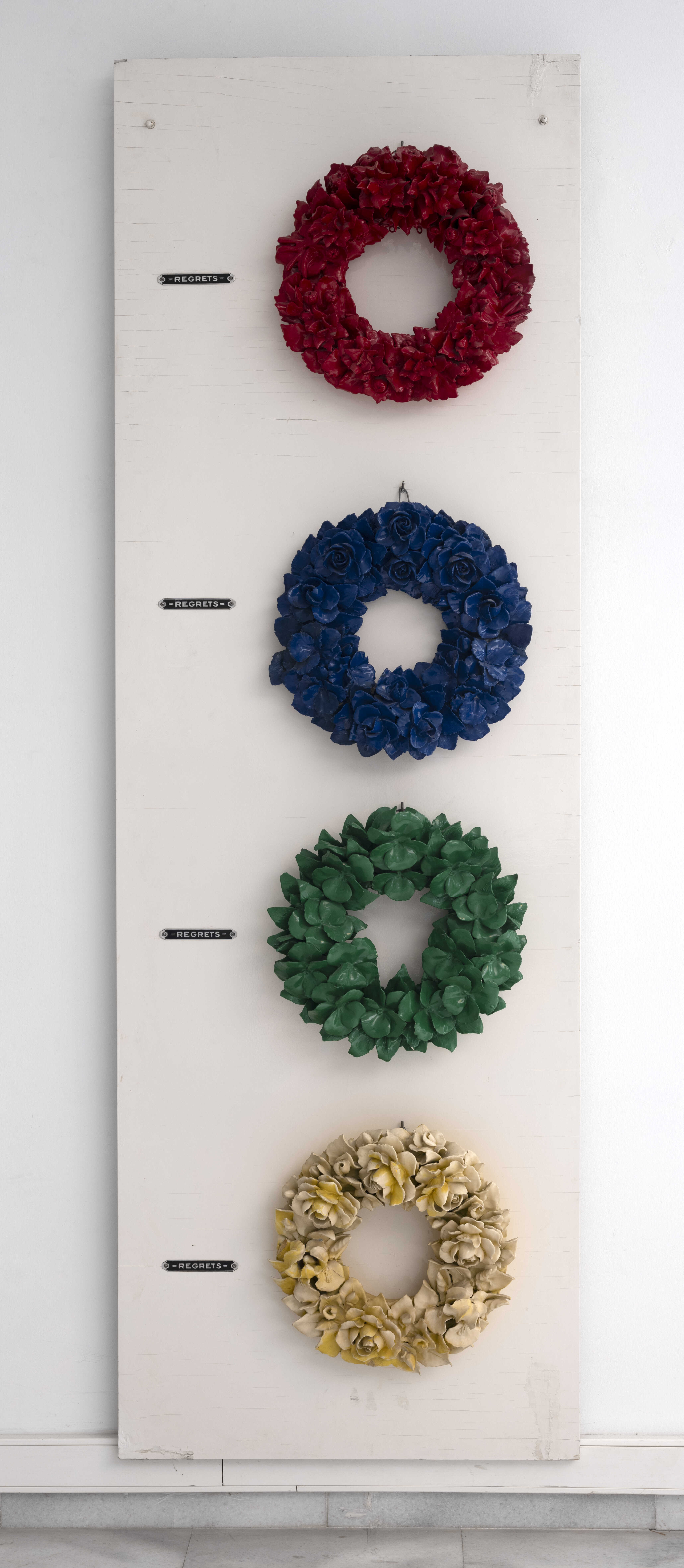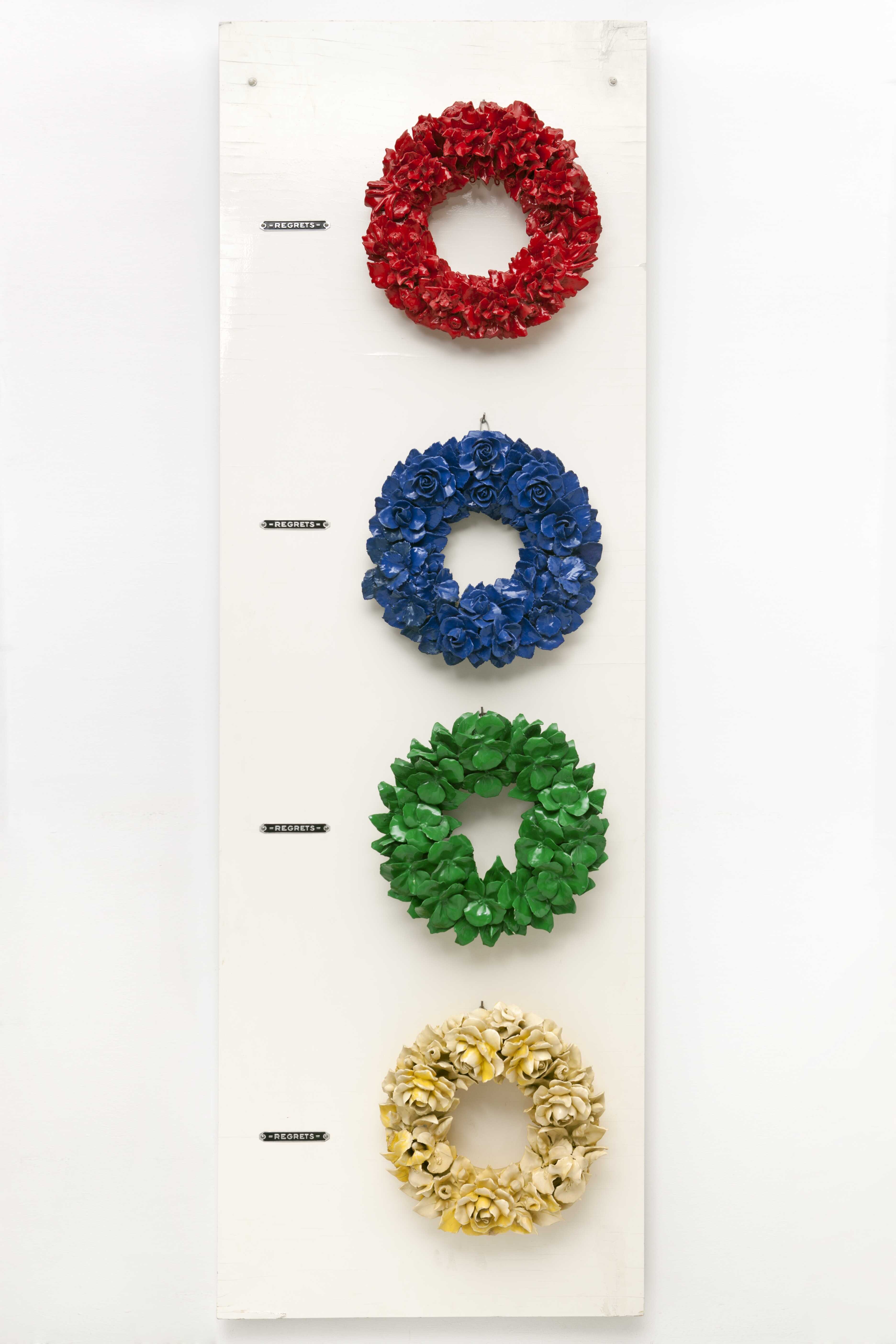 Το έργο «Συλλυπητήρια» του Jean Pierre Raynaud ανήκει σε μια μεγάλη ενότητα έργων που δημιουργεί τη δεκαετία του 1960 και ονομάζεται «Rouge, vert, jaune, bleu». Έχοντας ως αρχική σύλληψη την επανάληψη ενός βιομηχανικού προϊόντος σε διάφορα χρώματα και συνδυάζοντας τη με ένα ανθοκομικό μοτίβο που συνδέεται με τις σπουδές κηπουρικής, ο καλλιτέχνης υπό τον τίτλο «Συλλυπητήρια» δημιουργεί μια γλυπτική κατασκευή από ξύλο και πορσελάνη στην οποία επαναλαμβάνει το μοτίβο ενός στεφανιού στα τέσσερα χρώματα, εδώ με την ακόλουθη σειρά: κόκκινο, μπλε, πράσινο, κίτρινο.