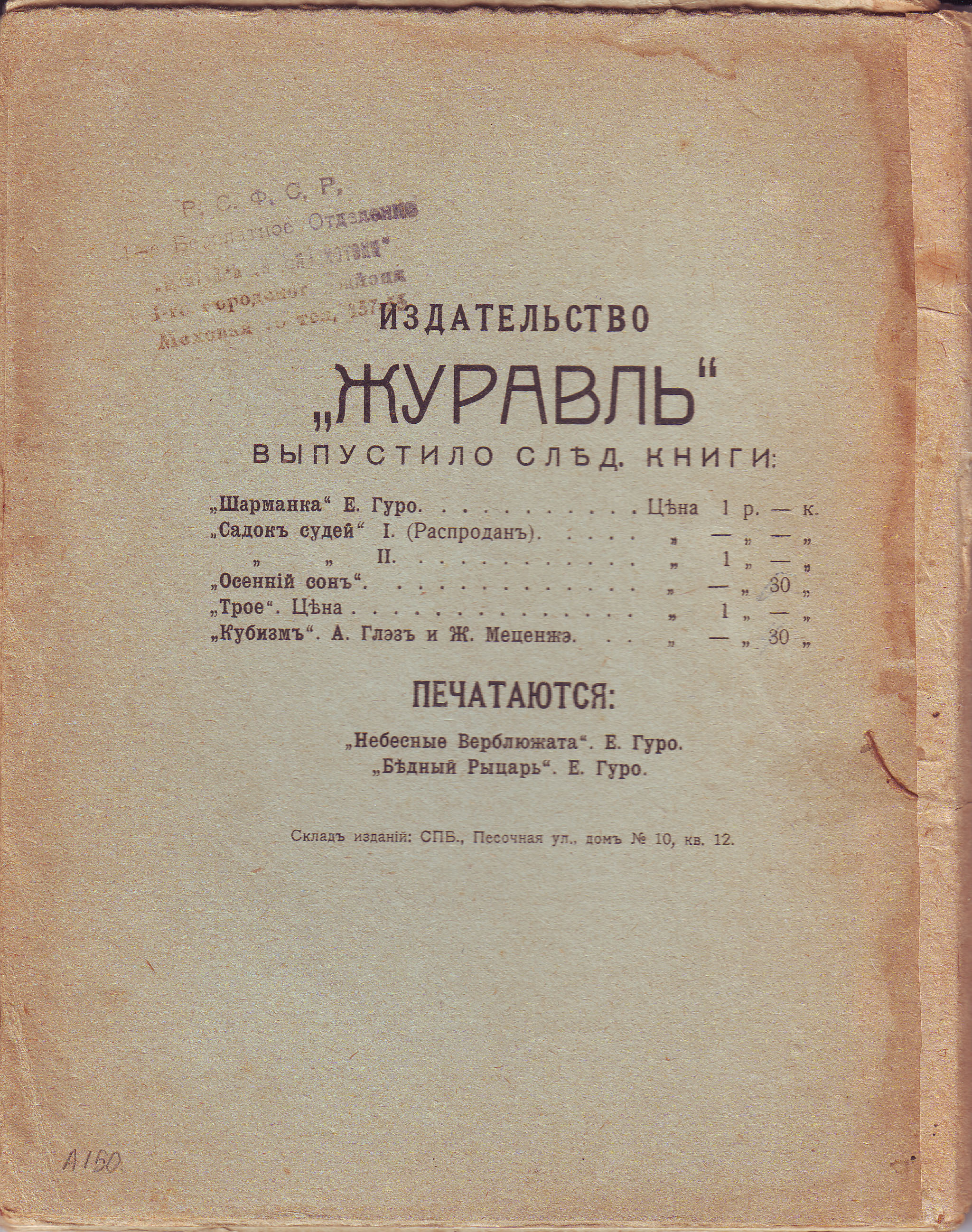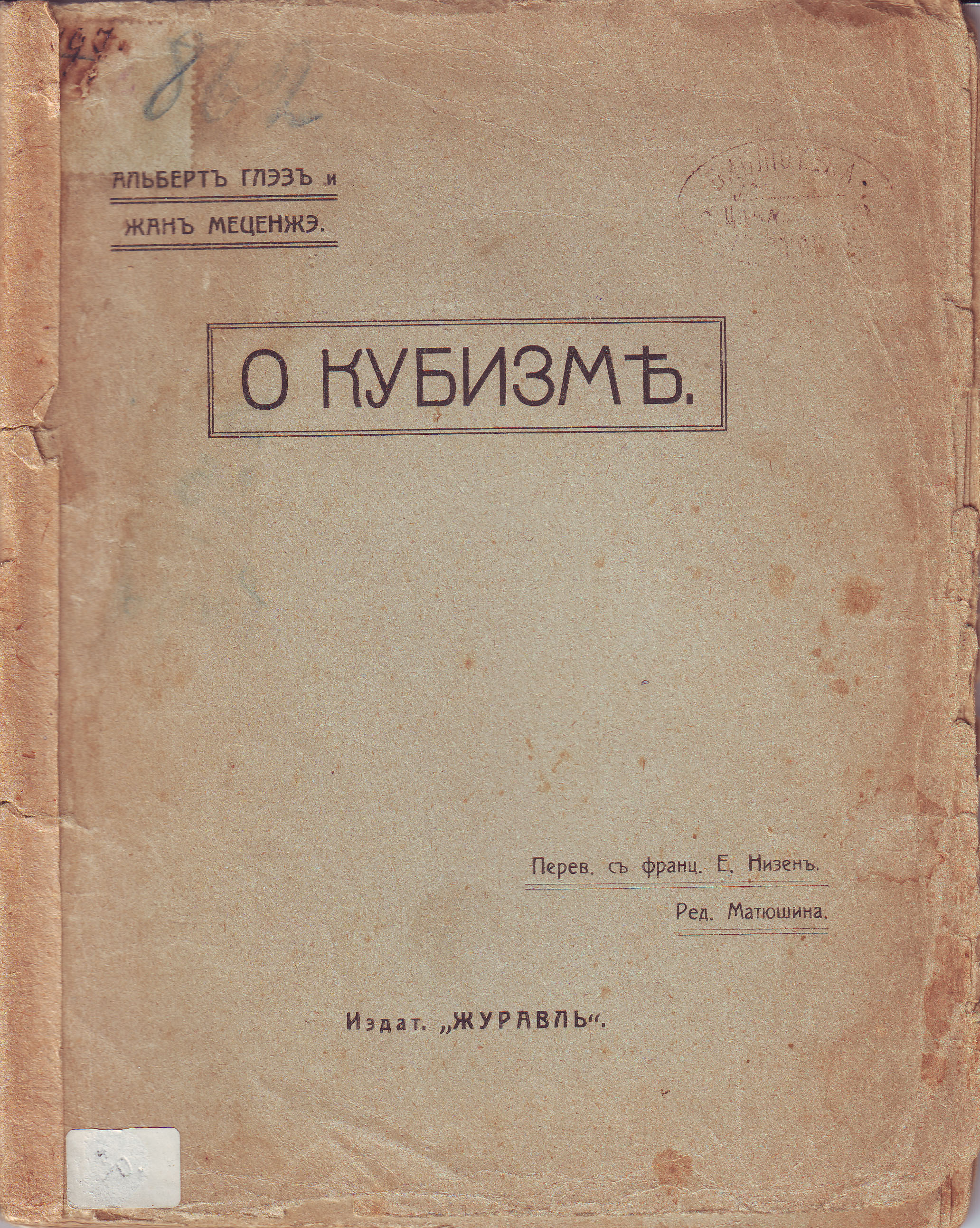 Βιβλίο με τίτλο "Περί Κυβισμού (O Kubisme)". Συγγραφείς: Gleizes Albert - Metzinger Jean. Αριθμεί 40 σελίδες, εξώφυλλο και οπισθόφυλλο. Είναι τυπωμένο σε πράσινο χαρτί. Έκδοση και επιμέλεια από τον Μιχαήλ Ματιούσιν, μετάφραση Εκατερίνα Νίζεν. Στο οπισθόφυλλο τα εξής: Εκδόσεις Zhuravl, τα βιβλία που κυκλοφόρησαν: Guro: Λατέρνα/ Sadok Sudei I & II/ Φθινοπωρινό Όνειρο/ Τρεις/ Κυβισμός Τα βιβλία που ετοιμάζονται για κυκλοφορία: Guro: Ιπτάμενα Καμηλάκια/ Φτωχός Ιππότης Σφραγίδα βιβλιοθήκης