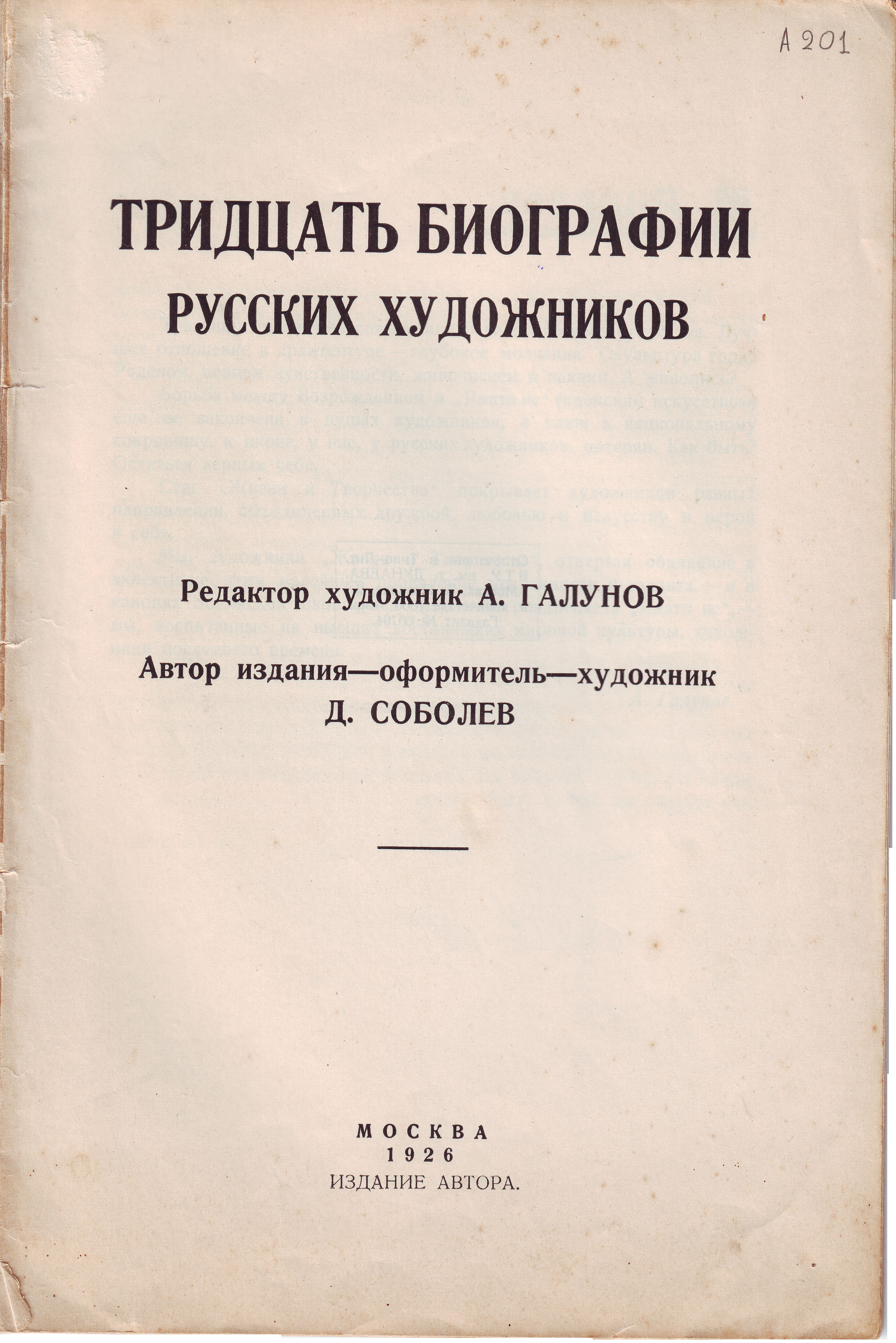 Βιβλίο με τίτλο "Τριάντα βιογραφίες Ρώσων καλλιτεχνών". Συντάκτης καλλιτέχνης: Α.Γκαλουνόφ. Καλλιτεχνικός επιμελητής έκδοσης: Ντ. Σόμπολεφ. Αριθμεί 50 σελίδες, ενώ το εξώφυλλο λείπει. Έκδοση του συγγραφέα, Μόσχα 1926. Τιράζ 1000.