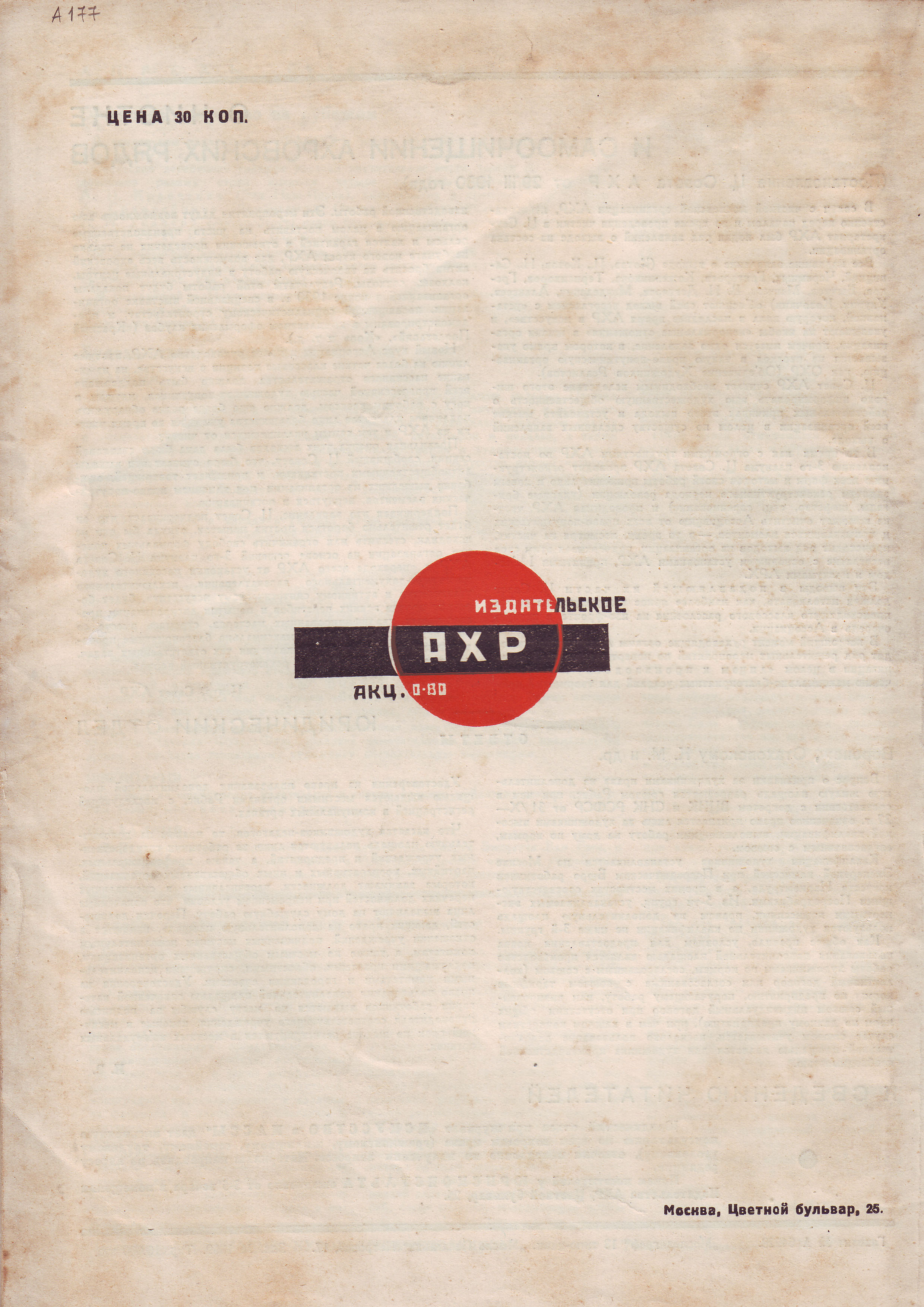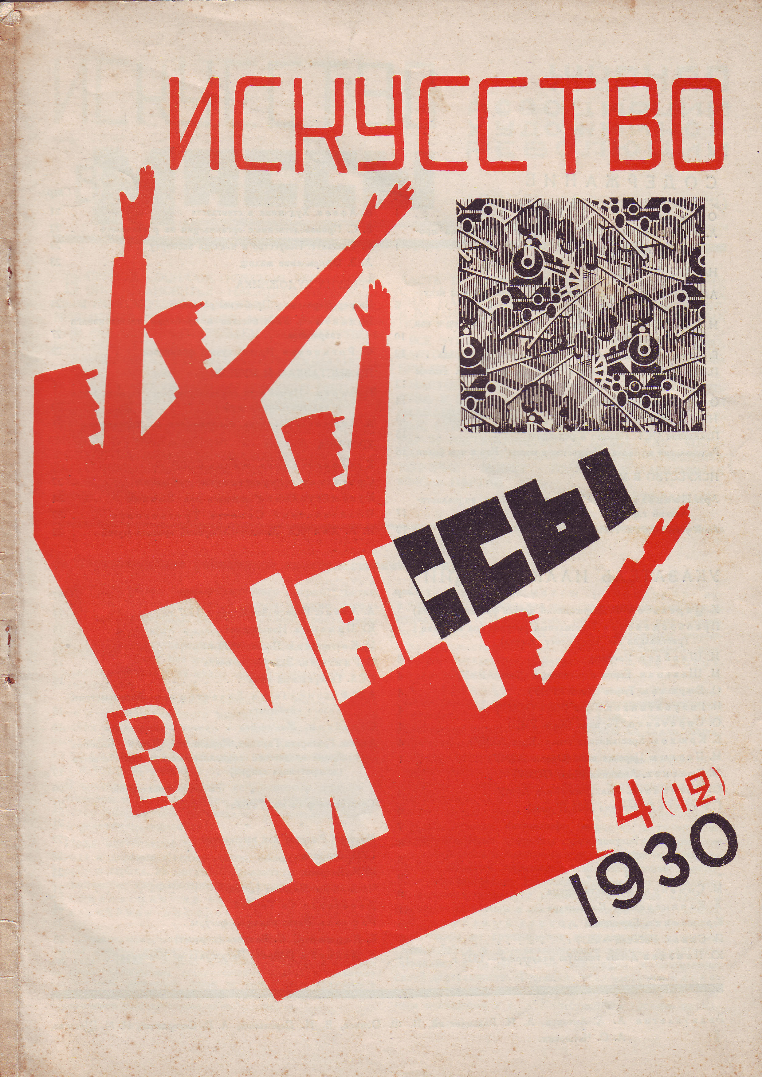 Καλλιτεχνικό περιοδικό με τίτλο "Η Τέχνη στις Μάζες" (Iskusstvo v Massy) τ.4 (12), τεύχος Απριλίου. Περιλαμβάνει 32 σελίδες, εξώφυλλο και οπισθόφυλλο. Εκδόθηκε από την ΑΧΡ (Ένωση Καλλιτεχνών Επανάστασης) σε 10000 αντίτυπα στη Μόσχα,1930. Τιμή 30 καπίκια.
