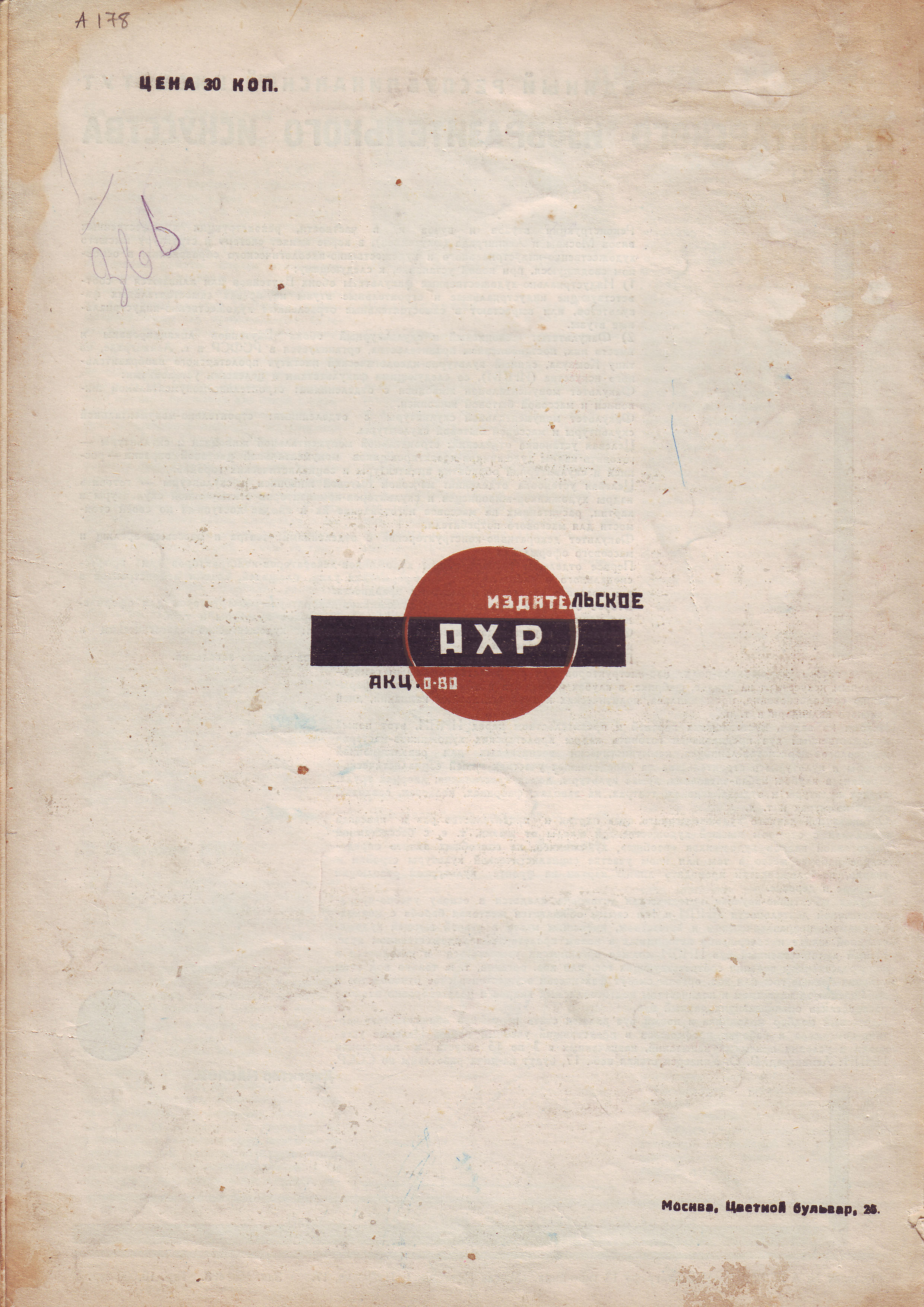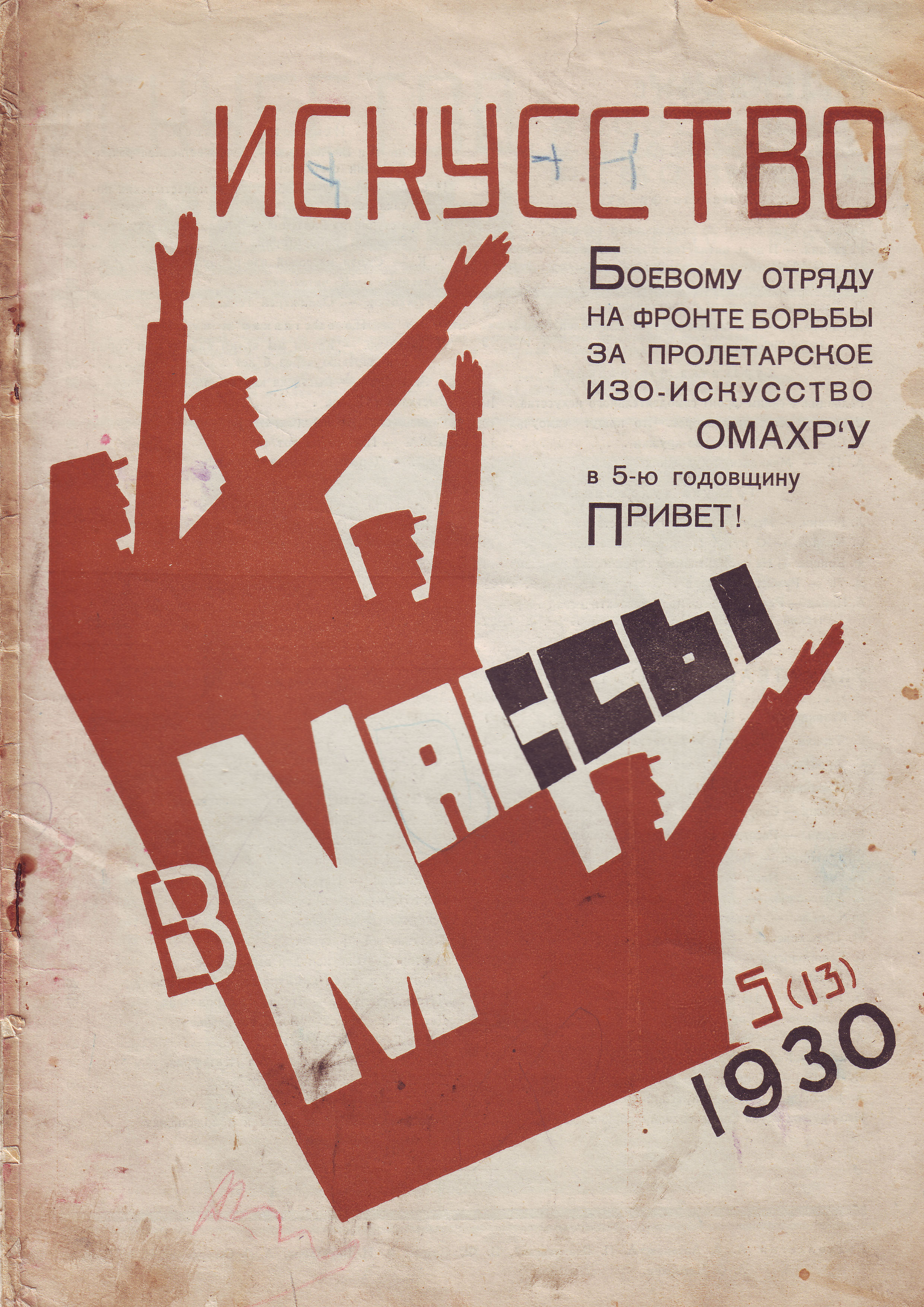 Καλλιτεχνικό περιοδικό με τίτλο "Η Τέχνη στις Μάζες" (Iskusstvo v Massy) τ.5 (13), τεύχος Μαΐου.. Περιλαμβάνει 32 σελίδες, εξώφυλλο και οπισθόφυλλο. Το τεύχος περιέχει αφιέρωμα στον Βλαντίμιρ Μαγιακόφσκι και στη γαλλική τέχνη του 19ου αιώνα (Ντελακρουά, Ζερικώ). Εκδόθηκε από την ΑΧΡ (Ένωση Καλλιτεχνών Επανάστασης) σε 10000 αντίτυπα στη Μόσχα, 1930. Τιμή 30 καπίκια.