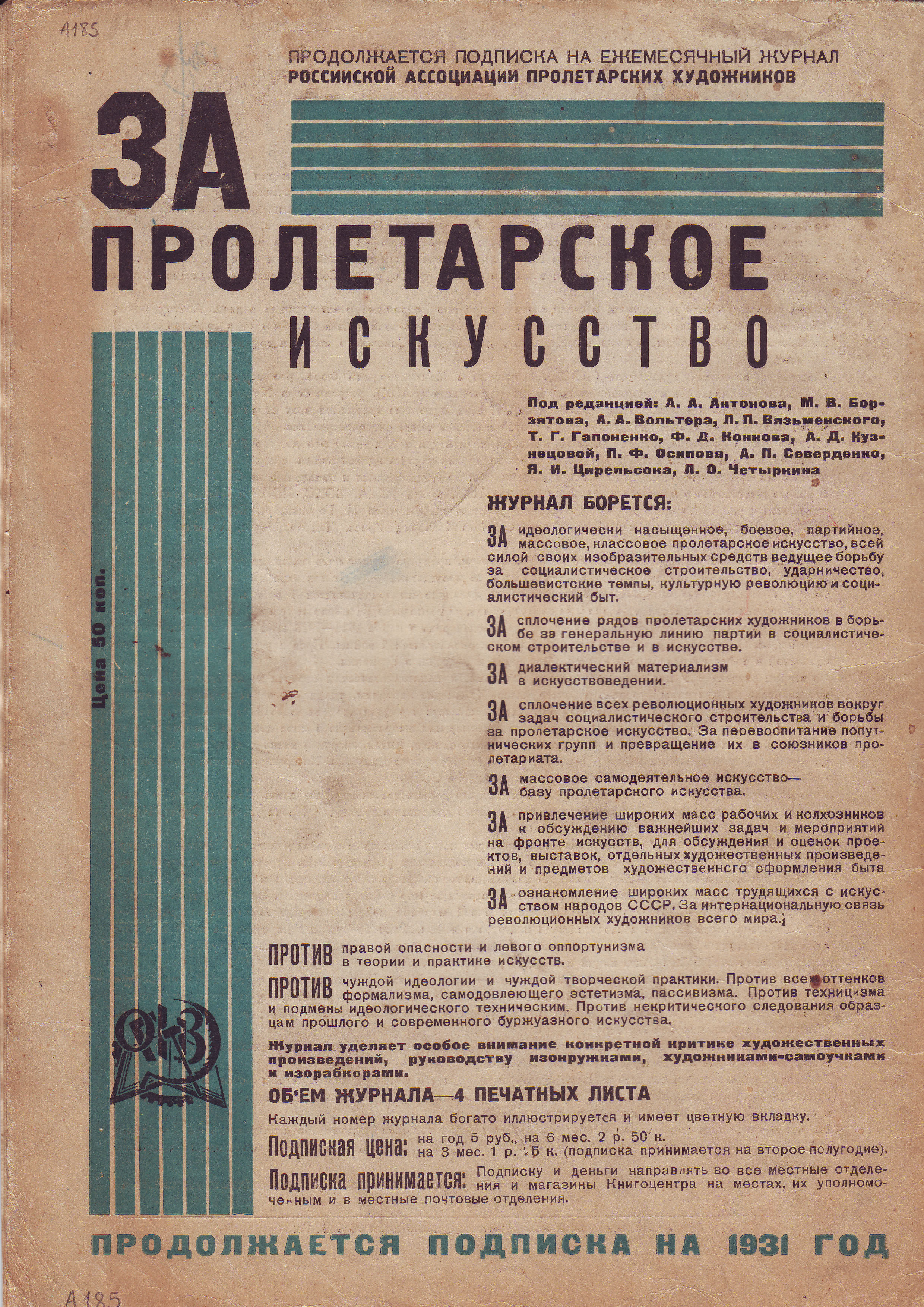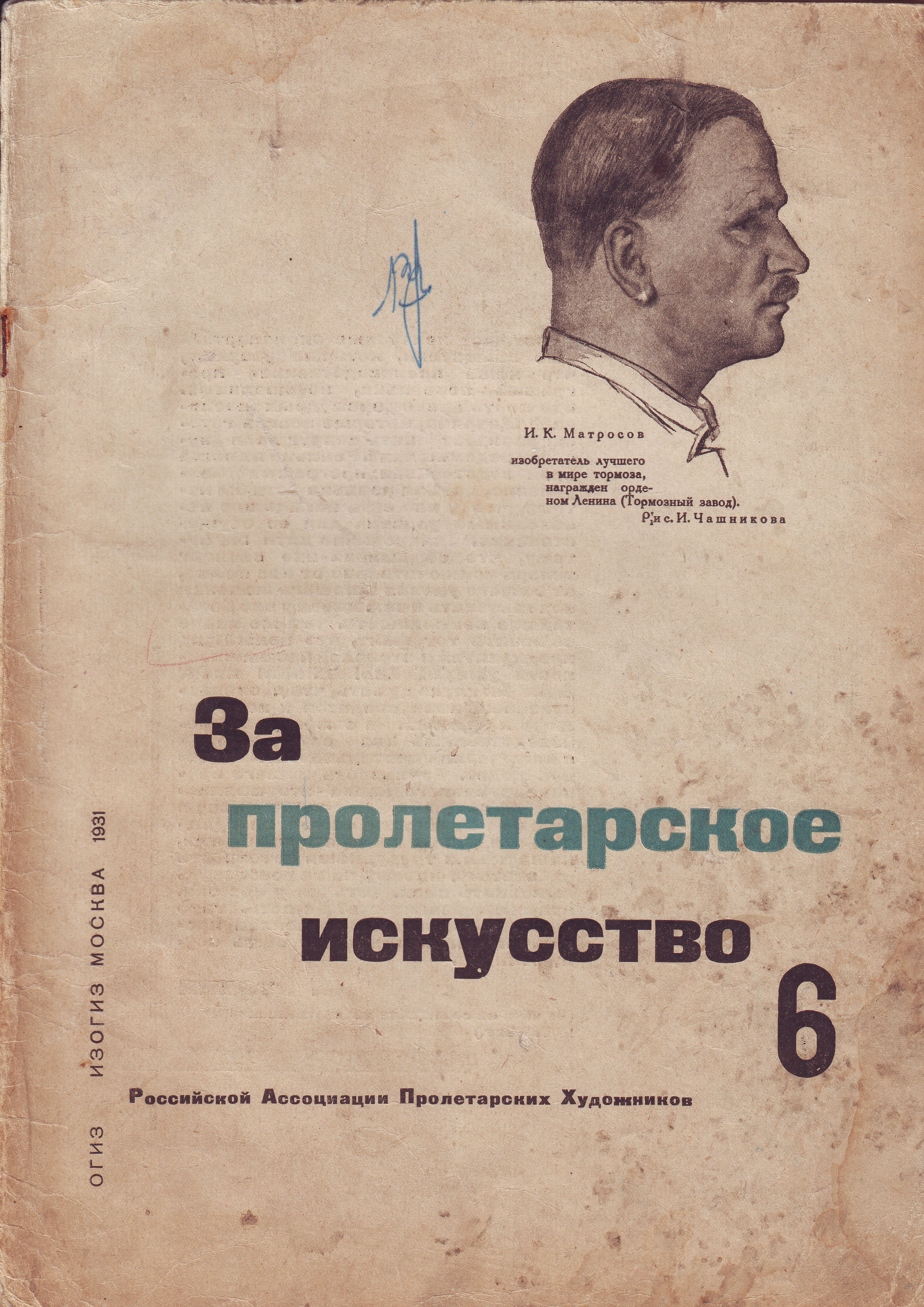 Καλλιτεχνικό περιοδικό με τίτλο "Για την Προλεταριακή Τέχνη" (За Пролетарское Искусства). Τεύχος Ιουνίου, Νο 6. Περιέχει αρνητική κριτική του A. Uss για τους Drevin, D.Burliuk, T.Mavrina (έκθεση "13") , D.Daran. Εκδόθηκε από τη Ρωσική Ένωση Προλεταρίων Καλλιτεχνών (Zhurnal Rossiitskoi Assotsiatsii Proletarskikh Khudozhnikov) σε 10000 αντίτυπα στη Μόσχα και στο Λένινγκραντ, 1931.