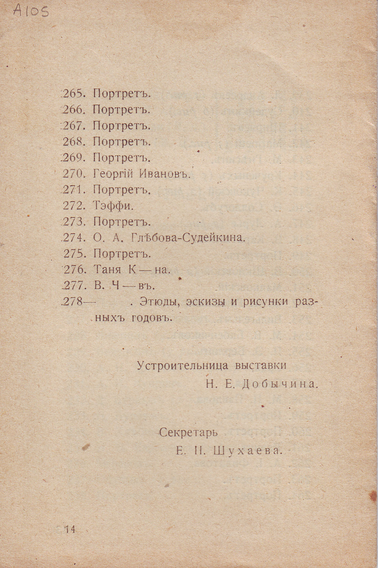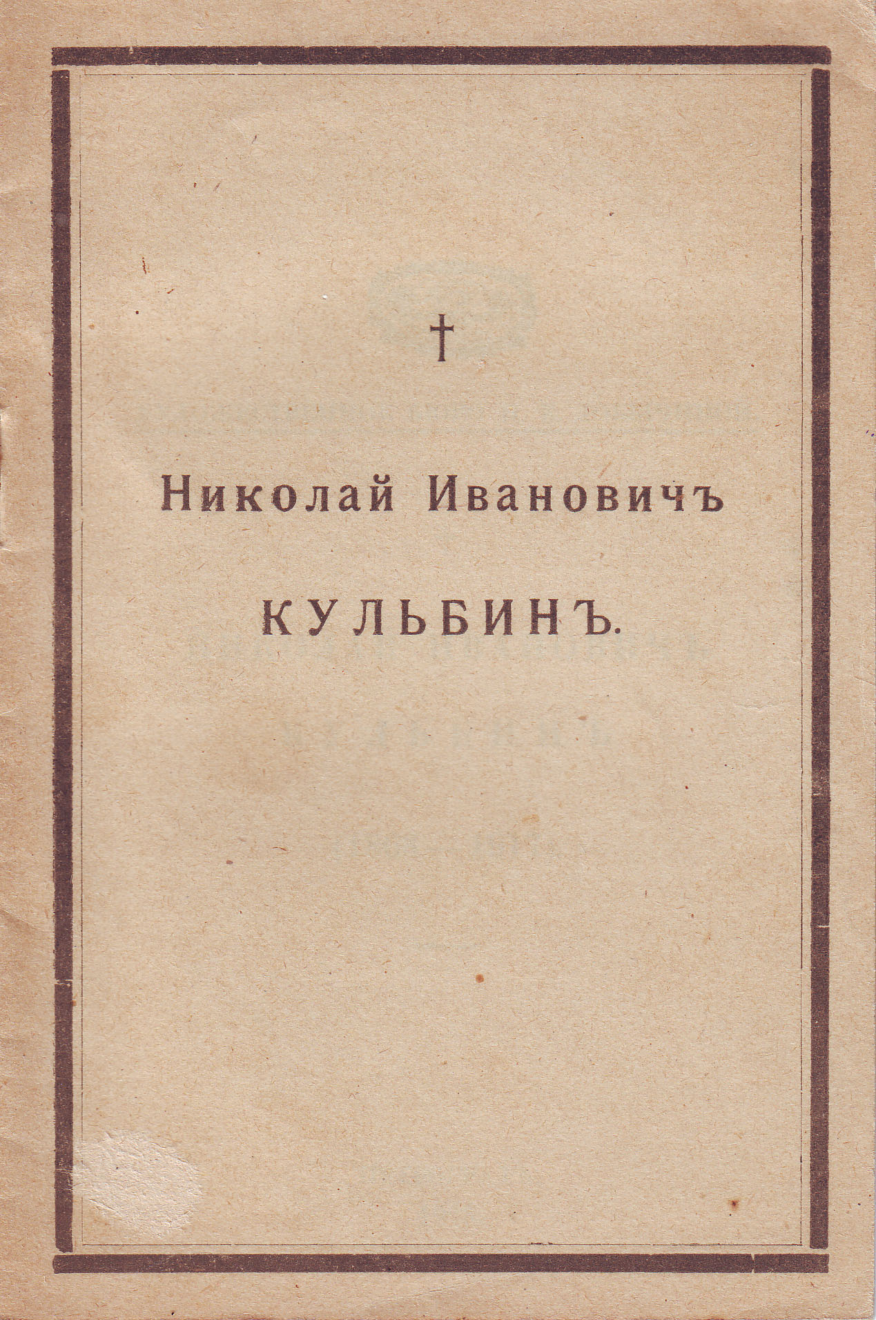 Κατάλογος της Μεταθανάτιας Έκθεσης του Nikolai Ivanovich Kulbin(1868 - 1917), που πραγματοποιήθηκε στο Khudozhestvenoe biuro N.E.Dobichinoi, Marsovo Pole 7, Πέτρογκραντ, 1918. Ο κατάλογος αριθμεί 14 σελίδες, εξώφυλλο και οπισθόφυλλο.