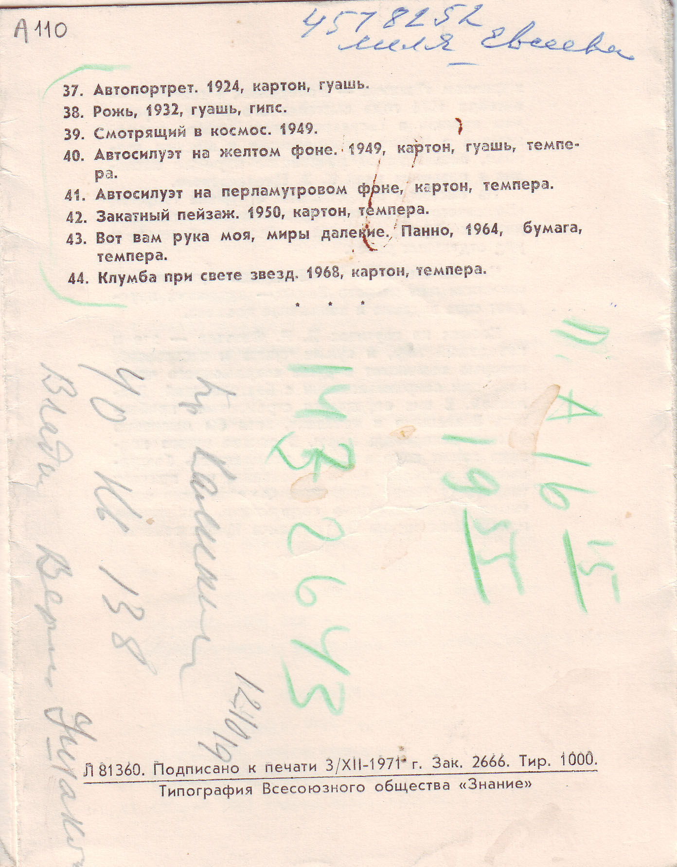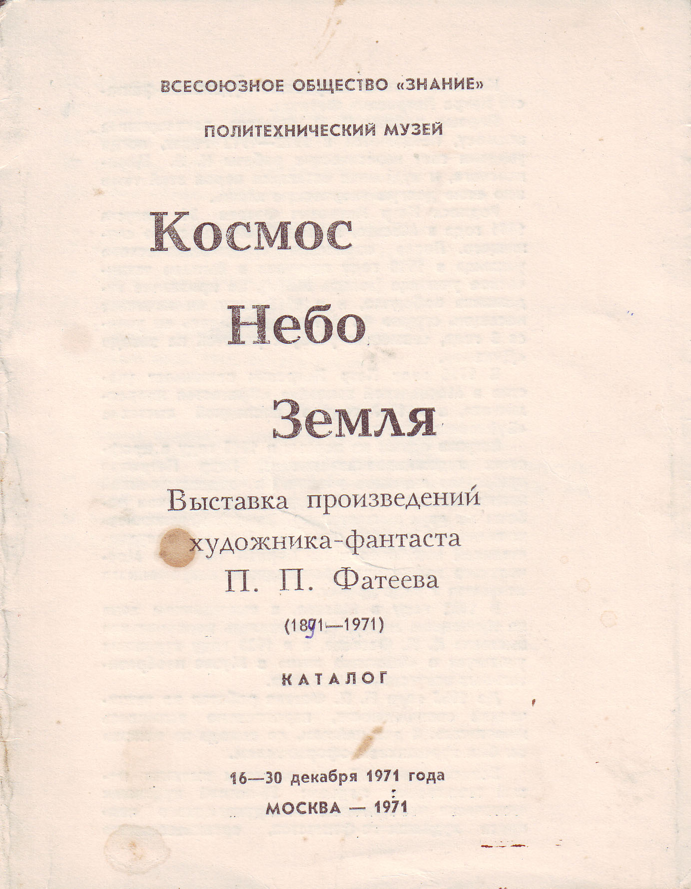 Τρίπτυχο - κατάλογος της έκθεσης με τίτλο "Διάστημα, Ουρανός, Γη" (Κosmos, Nebo, Zemlia) και υπότιτλο "Έκθεση του φαντασιακού καλλιτέχνη Π.Φατέγιεφ (1891-1971)" (Vystavka proizvedenii khudozhnika-fantasta P.Fateeva 1891-1971), που πραγματοποιήθηκε από τον Πανρωσικό σύλλογο "Znanie" και το Πολυτεχνικό Μουσείο (Polytechnicheskii Muzei) στη Μόσχα, 16-30 Δεκεμβρίου 1971. Περιλαμβάνει εισαγωγικό κείμενο και κατάλογο των έργων.