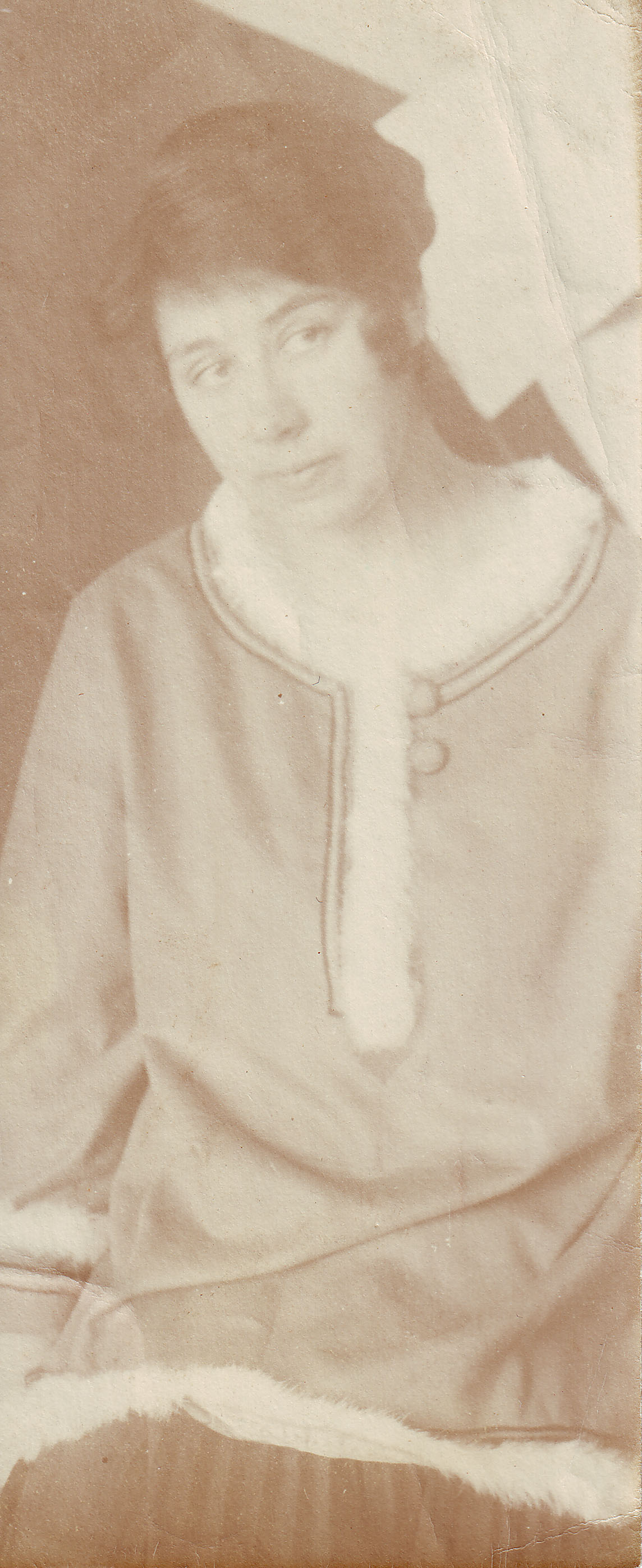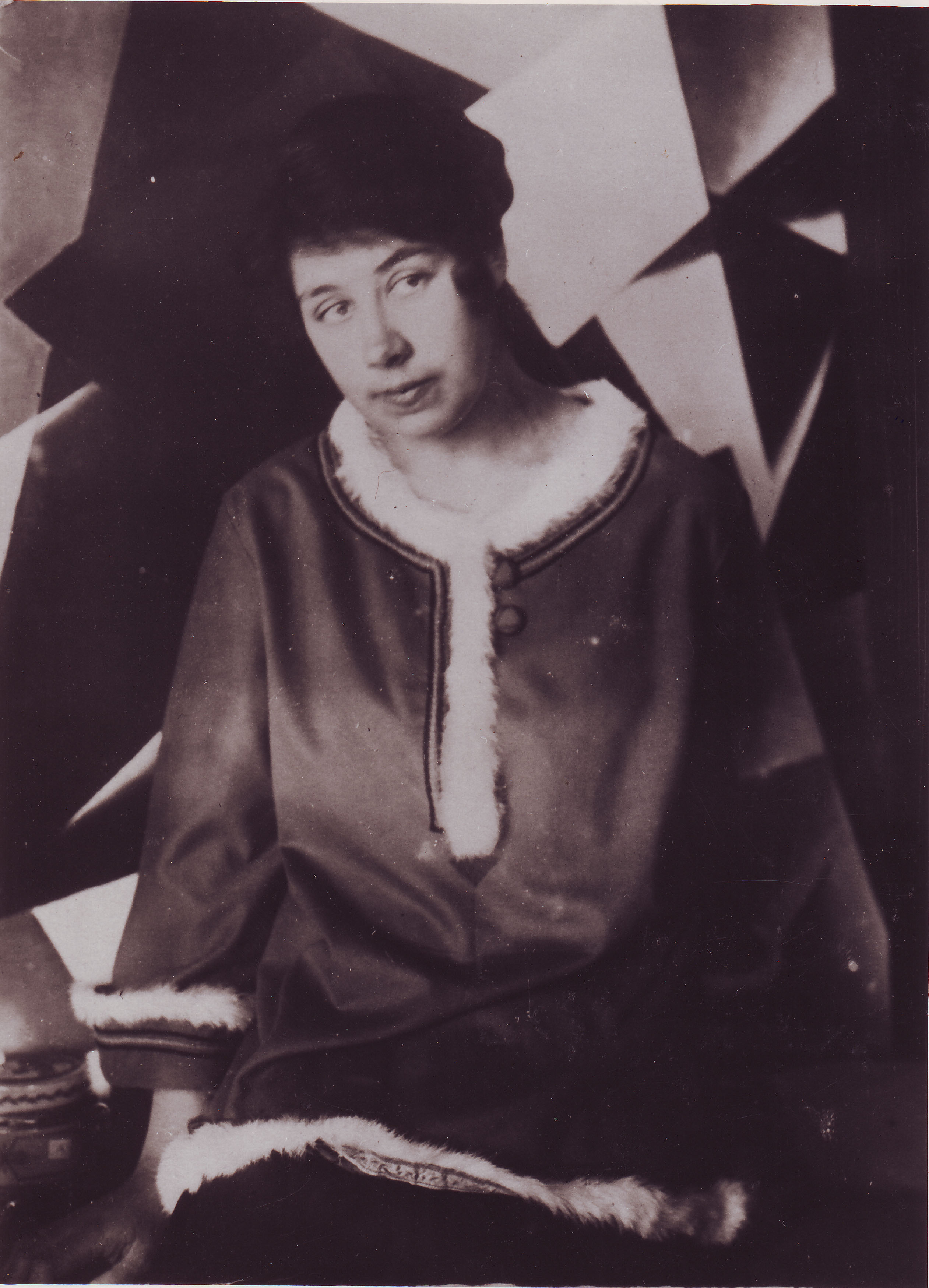Εικονίζεται η Λιουμπόβ Ποπόβα στο εργαστήριό της στη Μόσχα. Στο βάθος διακρίνεται ζωγραφικό έργο της, πιθανότατα από της σειρά Ζωγραφικά Αρχιτεκτονήματα.