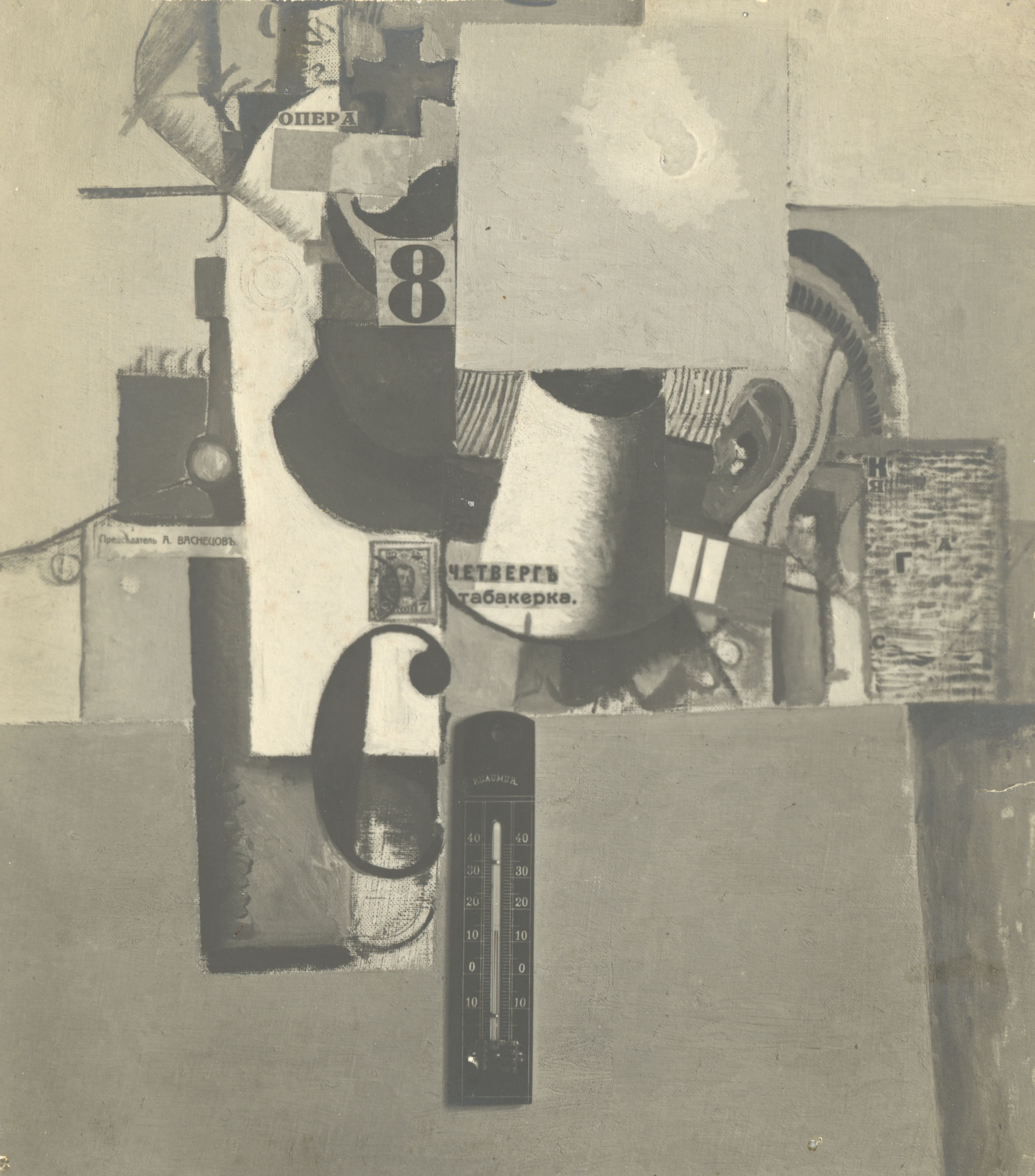 Ασπρόμαυρη φωτογραφική αναπαραγωγή του έργου του Καζιμίρ Μαλέβιτς με τίτλο "Στρατιώτης πρώτης γραμμής" (Ratnik 1-go razriada). Πρόκειται για κυβοφουτουριστική σύνθεση στο κέντρο της οποίας διακρίνεται ένα θερμόμετρο, ένα γραμματόσημο, καθώς και οι λέξεις Четвергъ, табакерке και ο αριθμός 8.