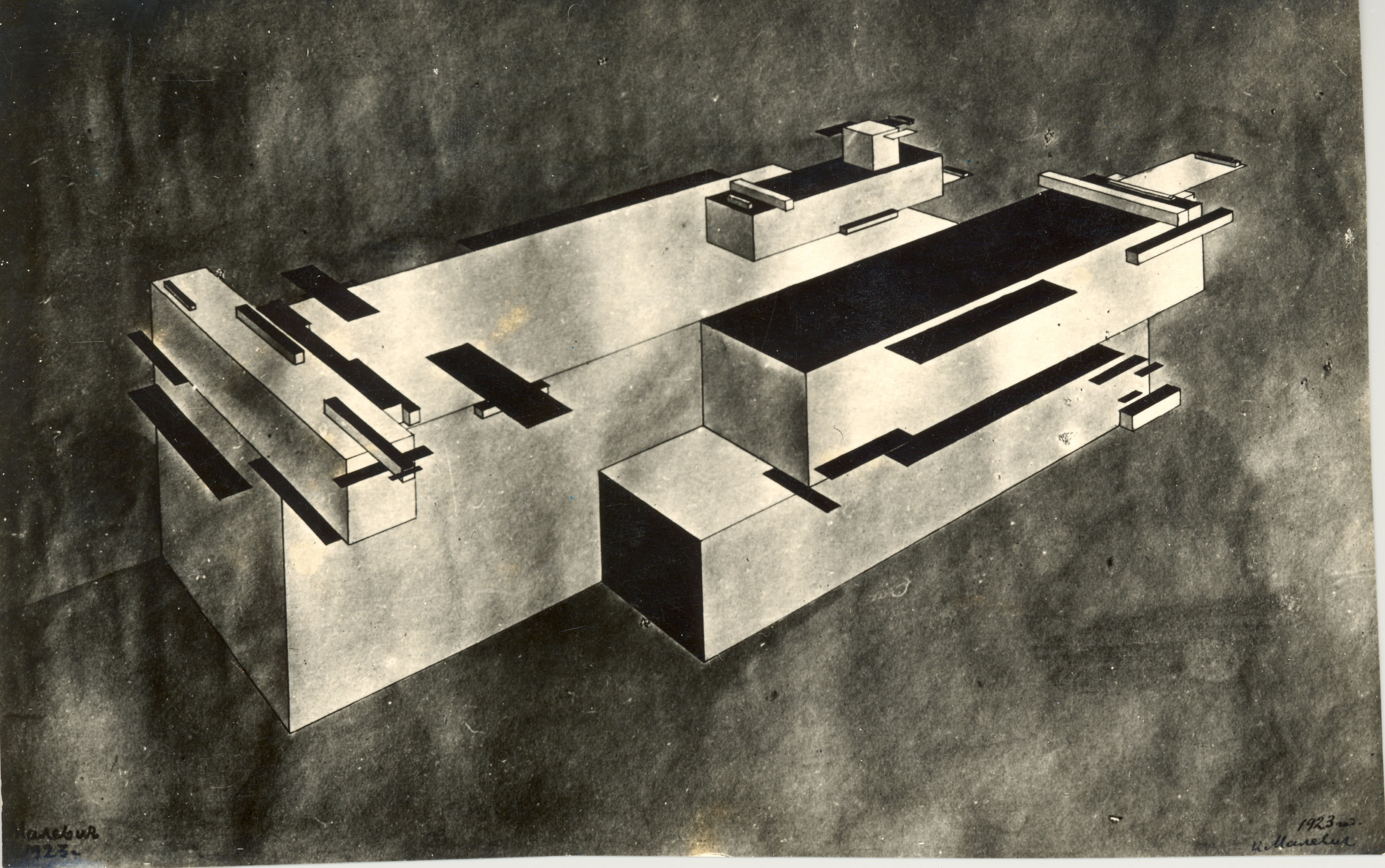 Ασπρόμαυρη φωτογραφία έργου του Καζιμίρ Μαλέβιτς με τίτλο "Δυναμική Κατασκευή". Πρόκειται για σουπρεματιστική σύνθεση από τη σειρά των Αρχιτεκτονημάτων του Μαλέβιτς.