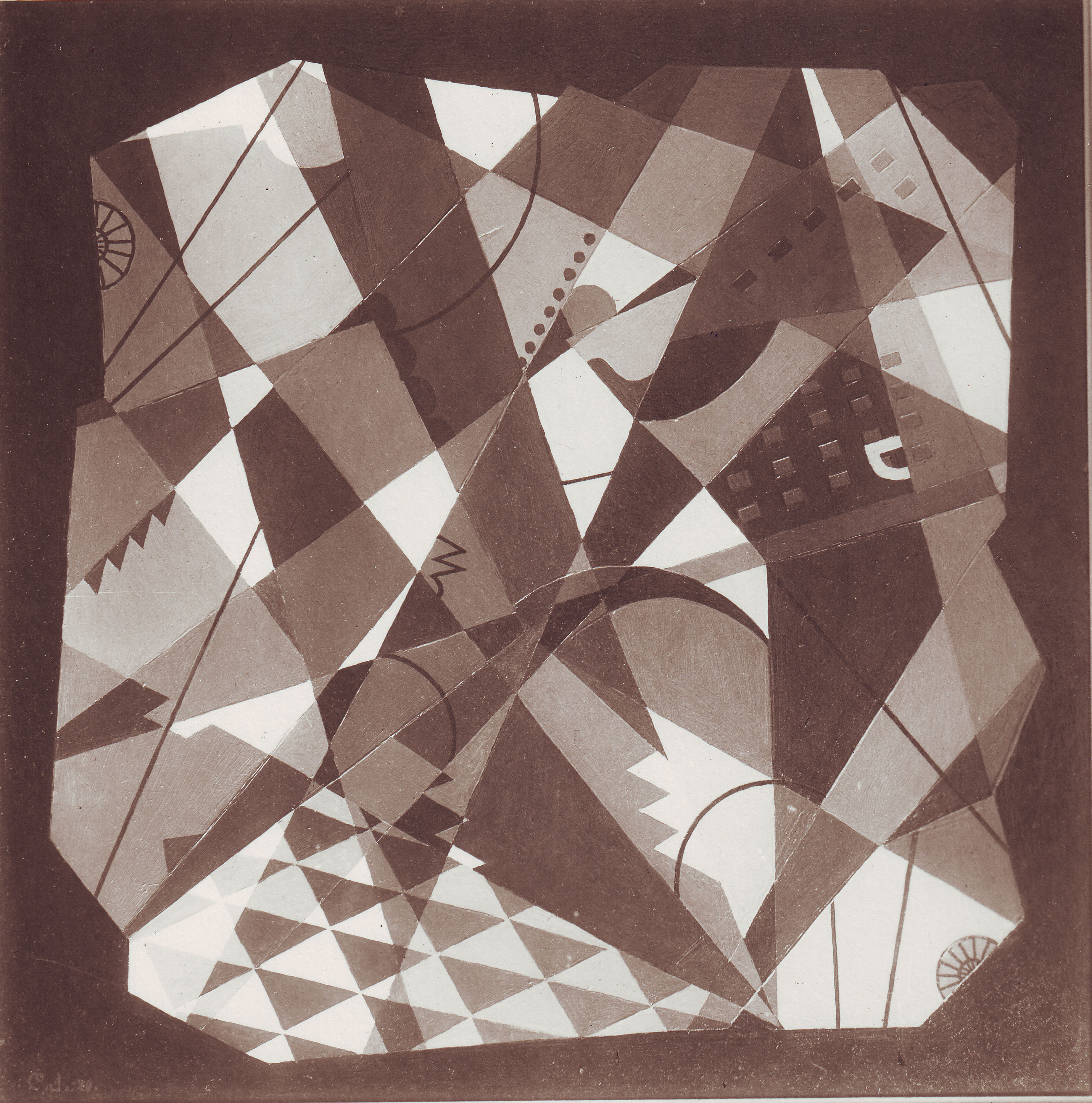 Ασπρόμαυρη φωτογραφική αναπαραγωγή έργου του Νταβίντ Κακαμπάτζε. Σύνθεση με γεωμετρικές φόρμες. Στην πίσω όψη χειρόγραφη σημείωση με μολύβι, η χρονολογία: 1920.