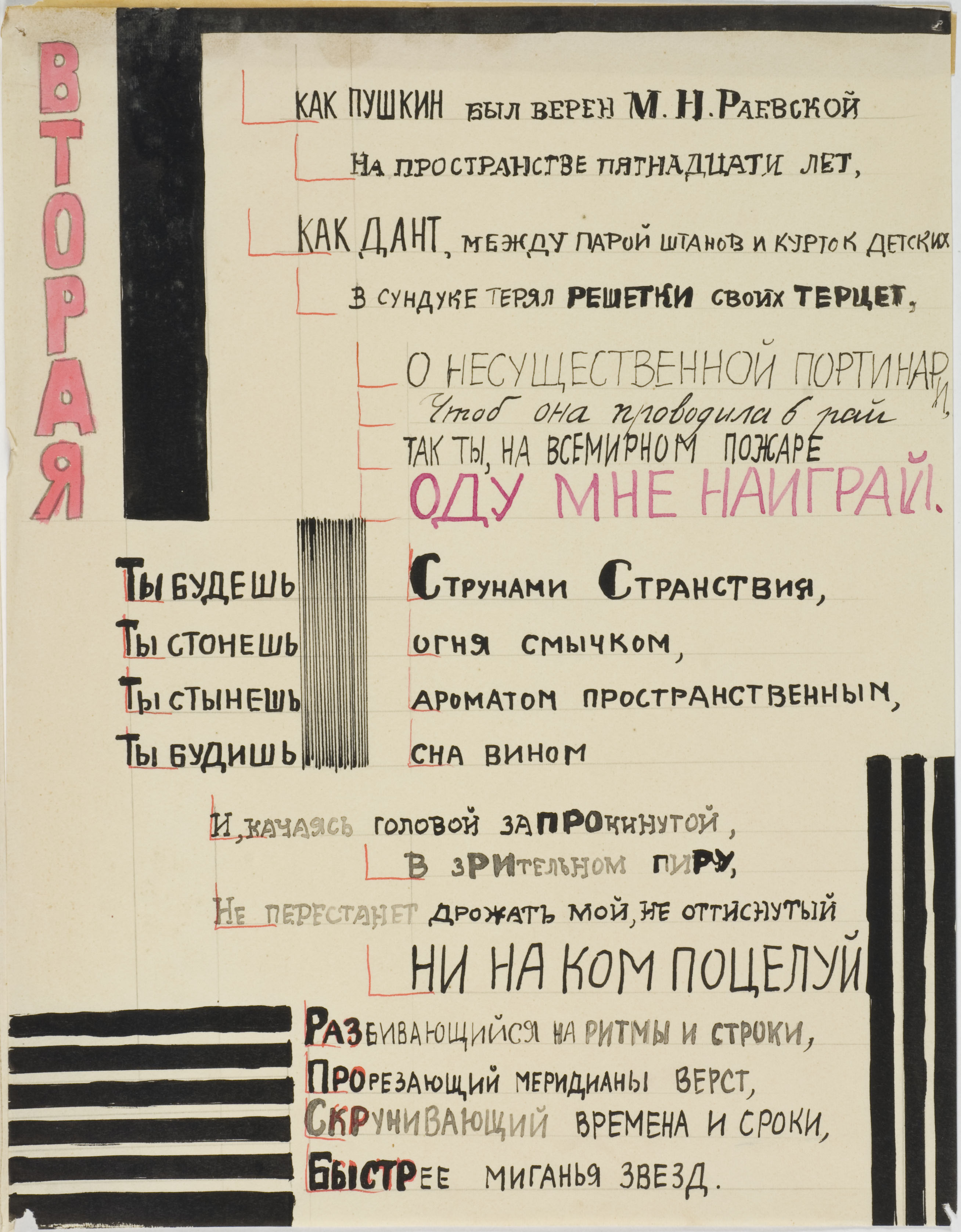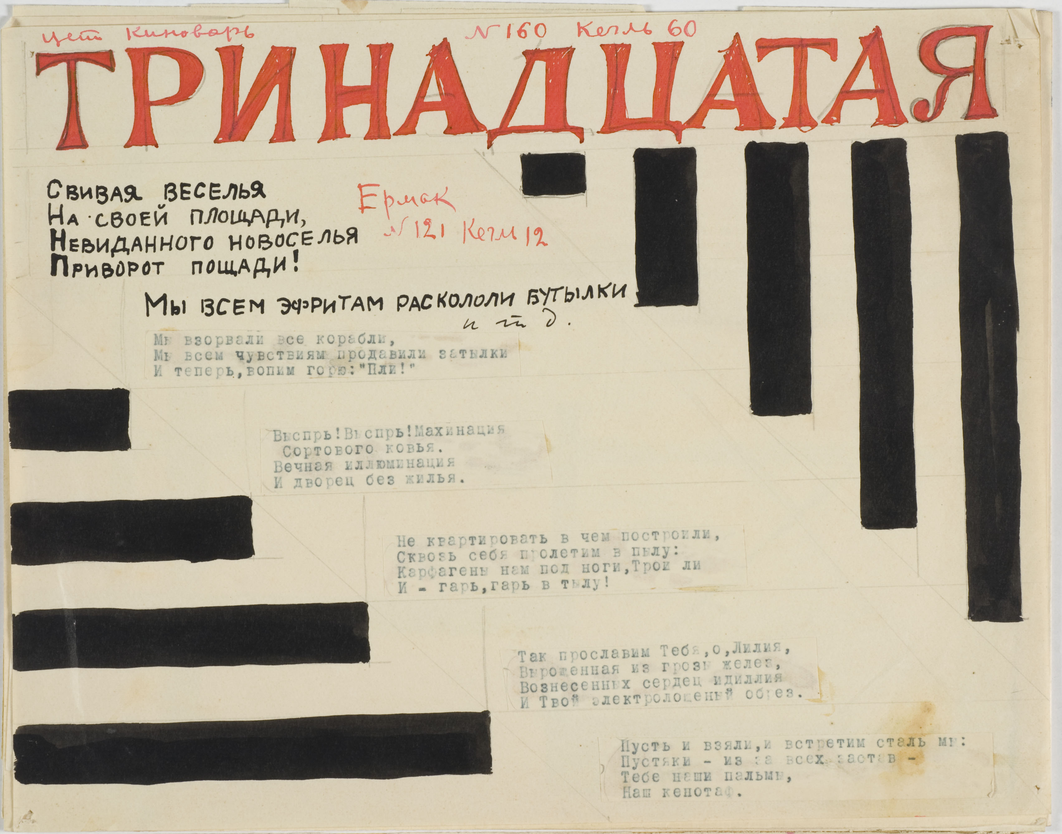 Γραφιστική σύνθεση που βασίζεται στην οριζόντια, και κατακόρυφη ενίοτε, διάταξη γραμμάτων, στη ρωσική γλώσσα, με τυπογραφικούς ή χειρόγραφους χαρακτήρες τυπικούς του κονστρουκτιβιστικού ύφους καθώς και ορθογώνια σχήματα σα λωρίδες, διαφορετικού πάχους, διατεταγμένα σε οριζόντια ή κατακόρυφη, ανεξάρτητη ή κατά παράταξη διάταξη. [Αφορά τις δημοσιευμένες μακέτες της καλλιτέχνιδας για την ποιητική συλλογή Eiffelaia («Αϊφελάγια») του Ι. Α. Aksenov (Αξιόνοφ).]