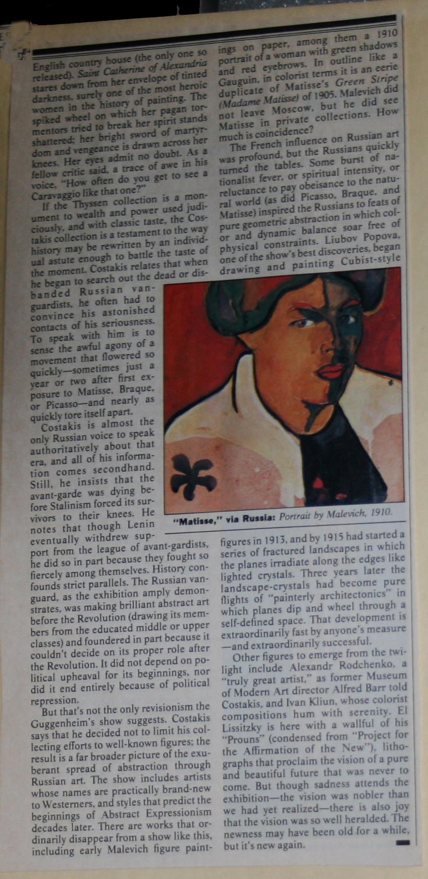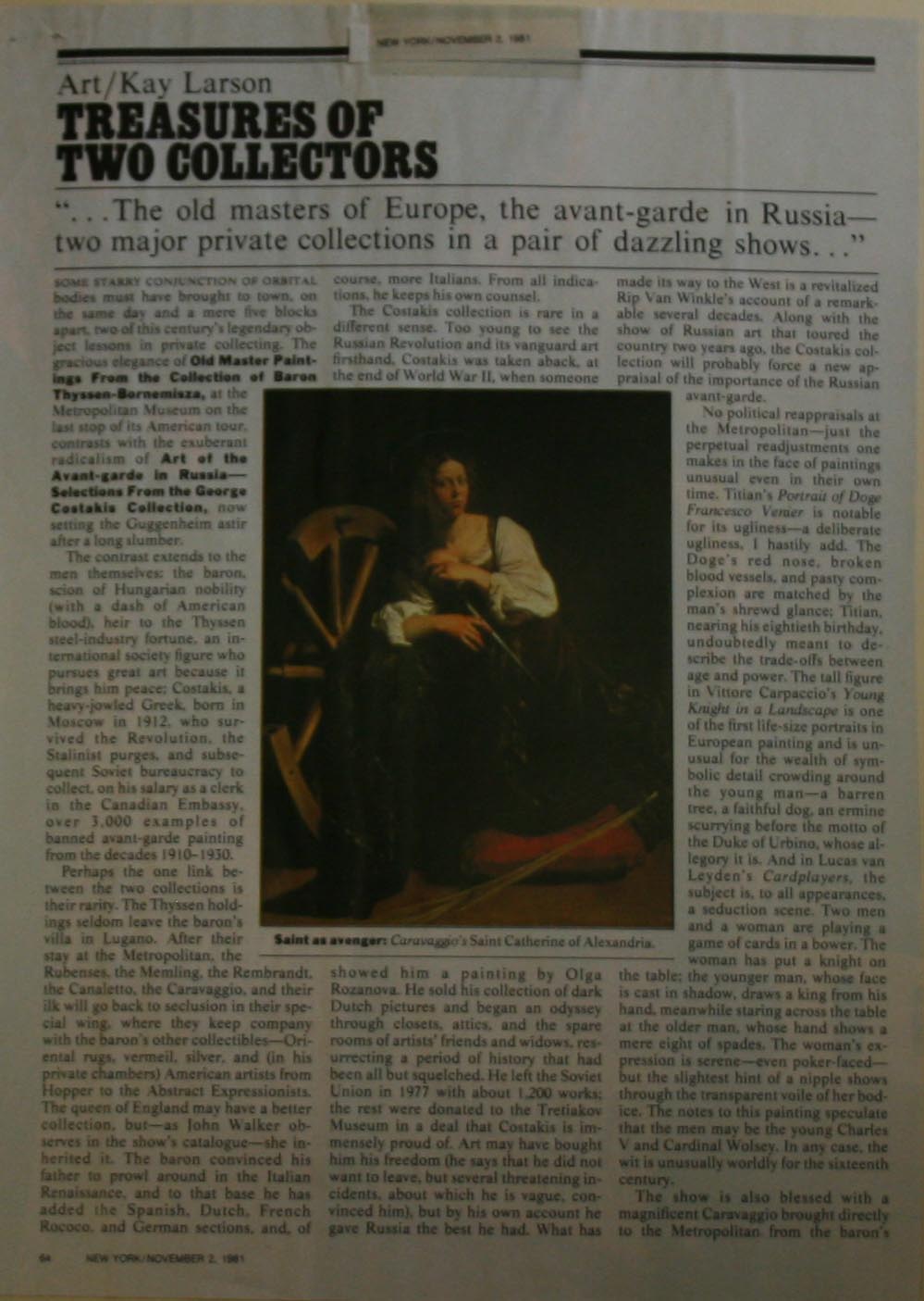ΑΠΟΚΟΜΜΑ ΠΕΡΙΟΔΙΚΟΥ, NEW YORK, ΑΡΘΡΟ ΤΟΥ KAY LARSON, ΜΕ ΤΙΤΛΟ: TREASURES OF TWO COOLECTORS, 2 ΝΟΕΜΒΡΙΟΥ 1981, ΠΑΡΟΥΣΙΑΣΗ ΤΗΣ ΕΚΘΕΣΗΣ ΤΗΣ ΣΥΛΛΟΓΗΣ ΚΩΣΤΑΚΗ ΣΤΟ ΜΟΥΣΕΙΟ GUGGENHEIM, 2 ΦΥΛΛΑ, 2 ΜΕΡΗ