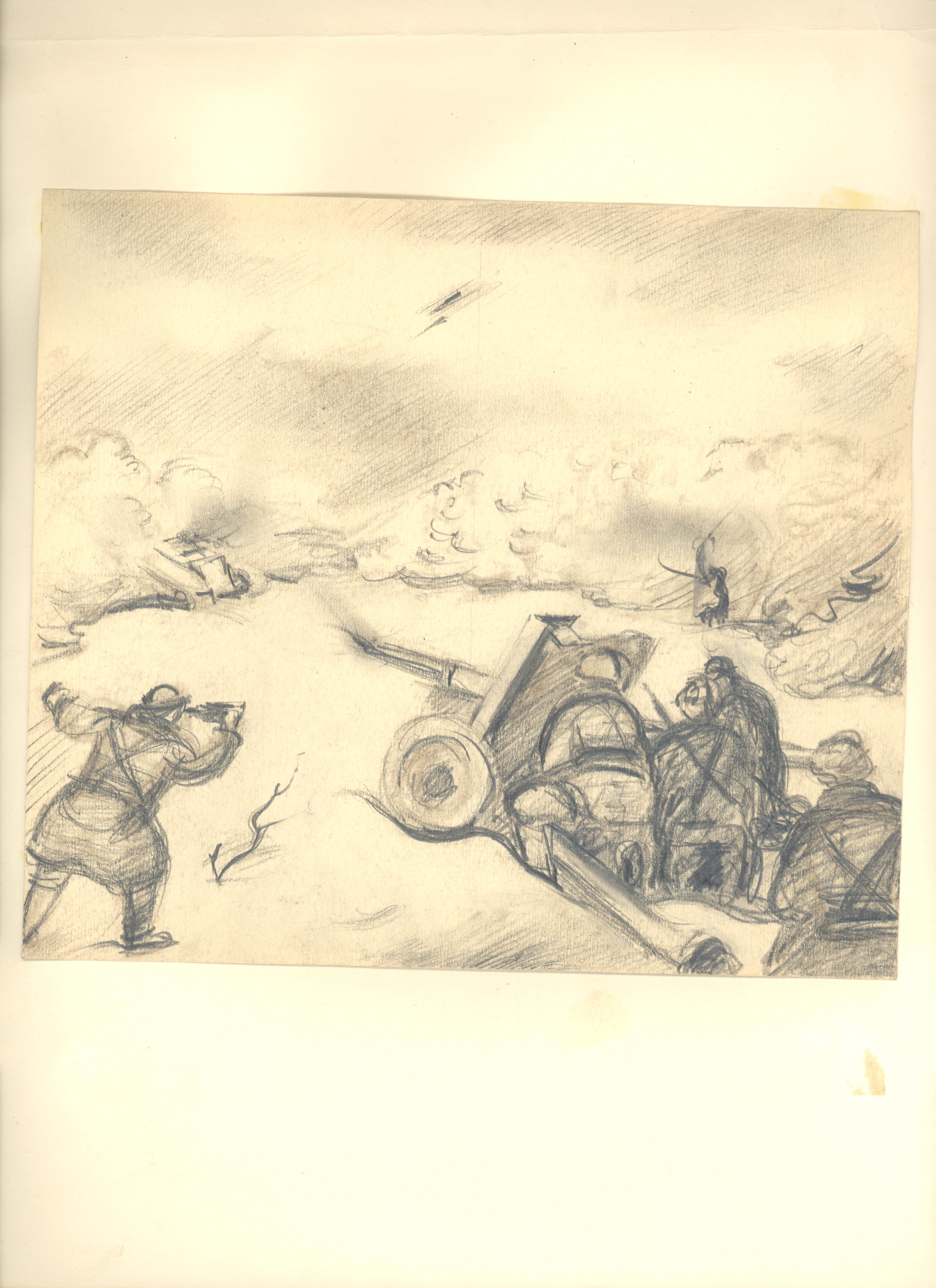 ΣΧΕΔΙΟ ΤΟΥ ΣΟΛΟΜΩΝ ΝΙΚΡΙΤΙΝ, ΜΕ ΜΟΛΥΒΙ ΚΑΙ ΧΡΩΜΑΤΙΣΤΟ ΜΟΛΥΒΙ, ΑΠΕΙΚΟΝΙΖΟΝΤΑΙ ΑΝΤΡΕΣ ΣΕ ΚΑΤΑΣΤΑΣΗ ΜΑΧΗΣ, ΤΟ ΣΧΕΔΙΟ ΕΊΝΑΙ ΕΠΙΚΟΛΛΗΜΕΝΟ ΣΕ ΜΕΓΑΛΥΤΕΡΟ ΚΕΝΟ ΦΥΛΛΟ, ΣΤΗΝ ΠΙΣΩ ΟΨΗ ΤΟΥ ΜΕΓΑΛΥΤΕΡΟΥ ΦΥΛΛΟΥ ΠΑΡΕΜΒΑΛΛΕΤΑΙ ΧΕΙΡΟΓΡΑΦΗ ΣΗΜΕΙΩΣΗ ΜΕ ΜΕΛΑΝΙ: ΜΑΧΗ, 18 Χ 20 1/2, 1942, 2 ΦΥΛΛΑ