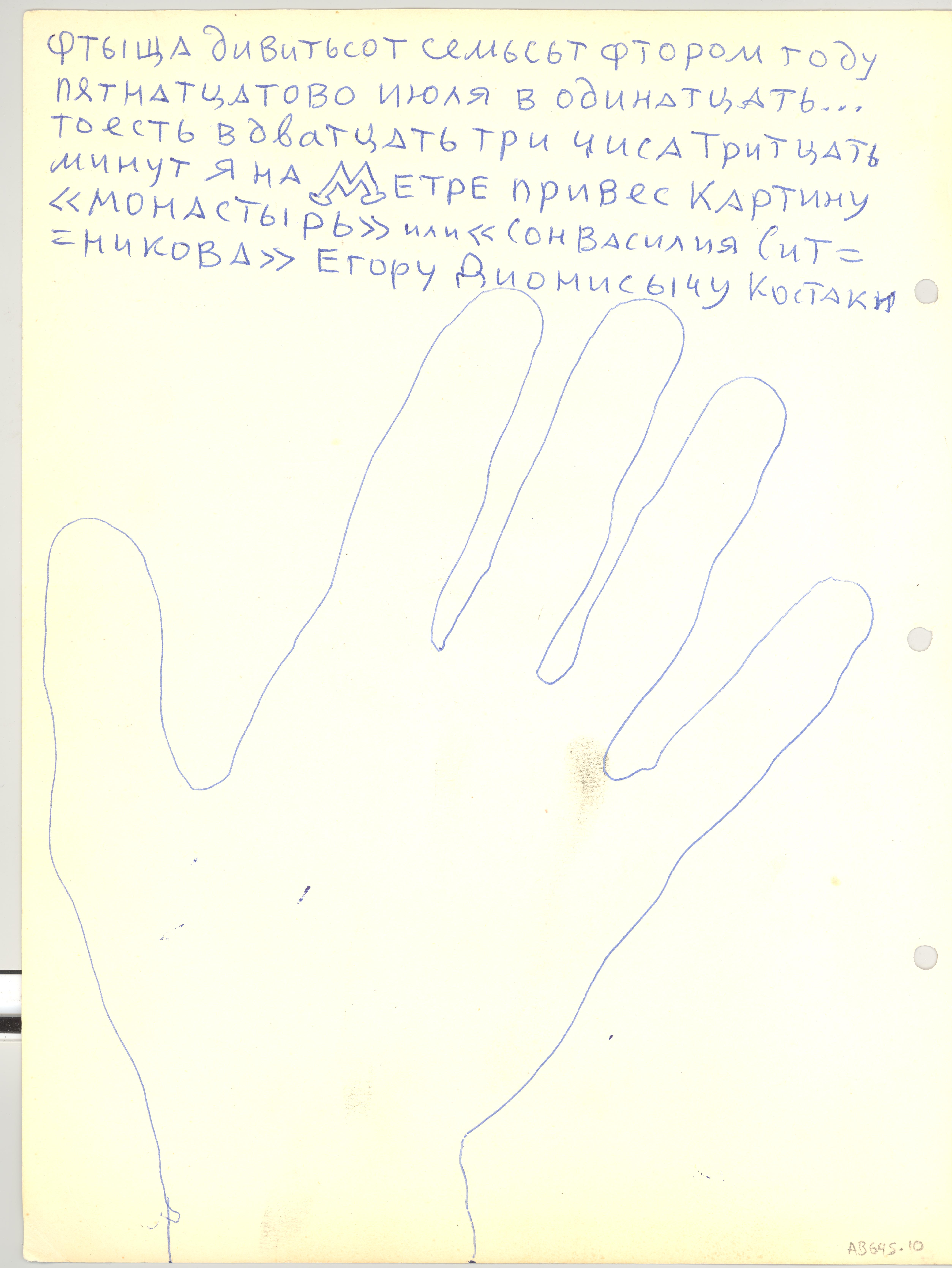 ΦΥΛΛΟ ΑΠΌ ΤΟ ΒΙΒΛΙΟ ΕΠΙΣΚΕΠΤΩΝ ΣΤΟ ΔΙΑΜΕΡΙΣΜΑ ΤΟΥ ΓΕΩΡΓΙΟΥ ΚΩΣΤΑΚΗ ΣΤΗ ΜΟΣΧΑ, ΠΑΡΕΜΒΑΛΛΟΝΤΑΙ ΧΕΙΡΟΓΡΑΦΕΣ ΣΗΜΕΙΩΣΕΙΣ ΜΕ ΜΕΛΑΝΙ, ΣΤΗΝ ΠΙΣΩ ΟΨΗ ΠΑΡΕΜΒΑΛΛΕΤΑΙ ΧΕΙΡΟΓΡΑΦΗ ΣΗΜΕΙΩΣΗ ΜΕ ΜΕΛΑΝΙ ΚΑΙ ΣΧΕΔΙΟ ΜΕ ΜΕΛΑΝΙ ΠΟΥ ΑΠΕΙΚΟΝΙΖΕΙ ΤΟ ΠΕΡΙΓΡΑΜΜΑ ΜΙΑΣ ΠΑΛΑΜΗΣ, 1 ΦΥΛΛΟ